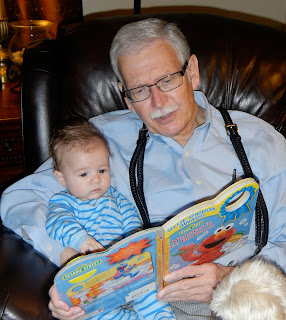 | A truly classic picture of my husband, "Grandpa", reading to Levi, 11 weeks old. |